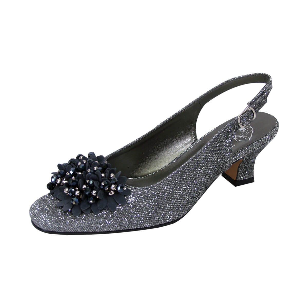 FLORAL Natalie women's extra wide width evening dress pump adds a stunning look to complement your outfit. This ladies' 1.5" low-heel slingback accented with a decorative flower bow on the toe cap and all metallic glitter upper is the perfect choice for that special occasion.