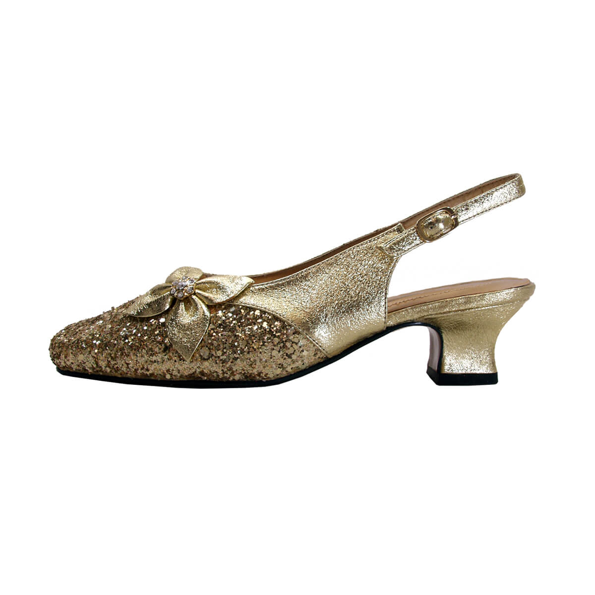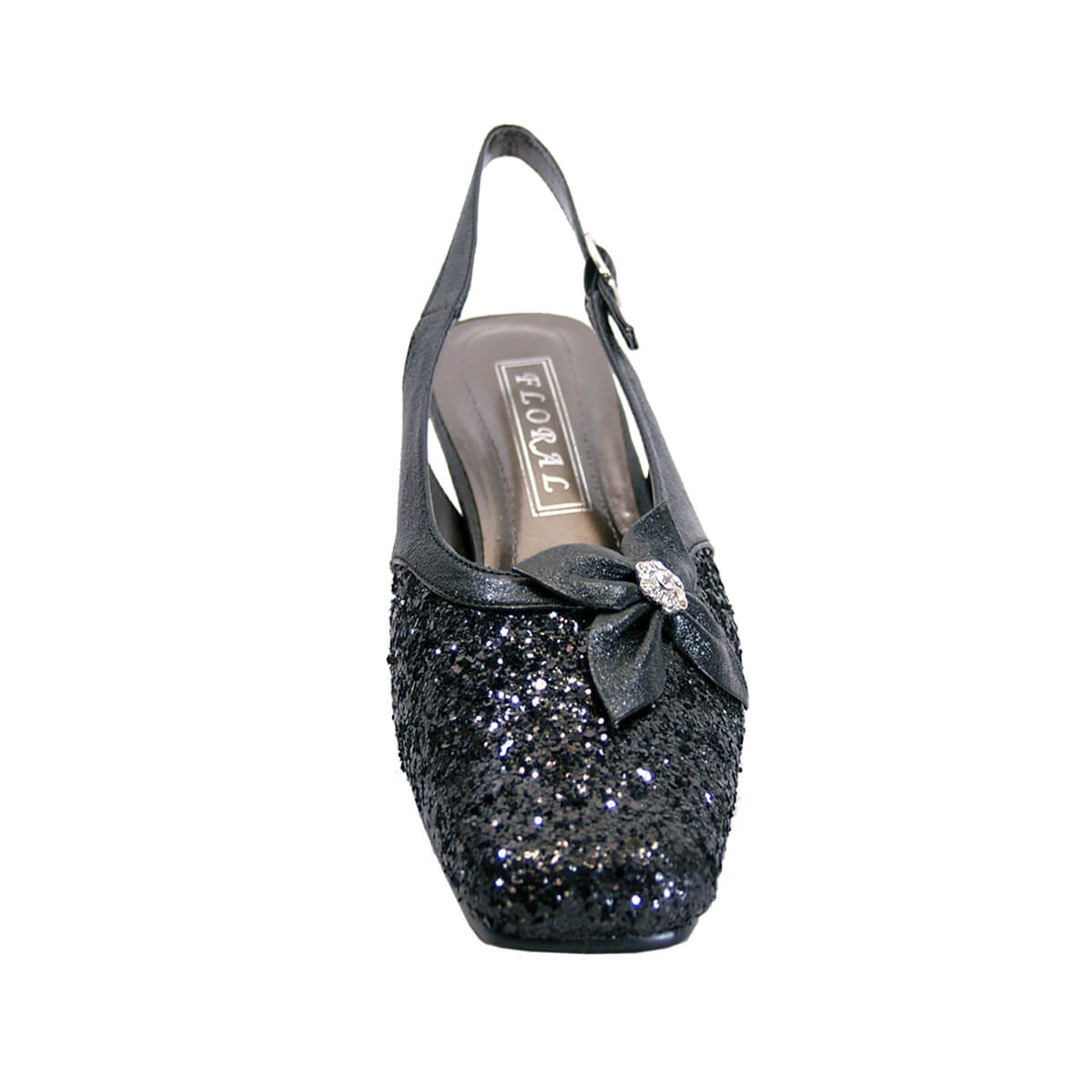 FLORAL Yesenia women's extra wide width shoes feature a metallic fabric upper with a 1.5" low-heel. With its square toe cap and a glitter front with crystal bow are ready to dress you up for any occasion. The cushioned insole allows for a full day of comfort. The rubber sole brings maximum surface traction making anyone walking around feel at ease.