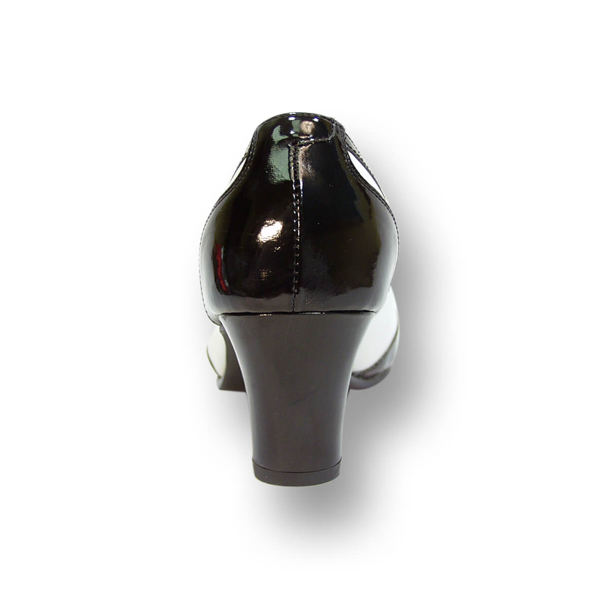 PEERAGE Rachel women's extra wide width spectator style dress pump for evening affairs. This ladies 2.5" mid heel features a white leather vamp with complementing black patent leather upper adorned with a decorative bow on toe cap creates a sleek and polished look that will enhance any style.